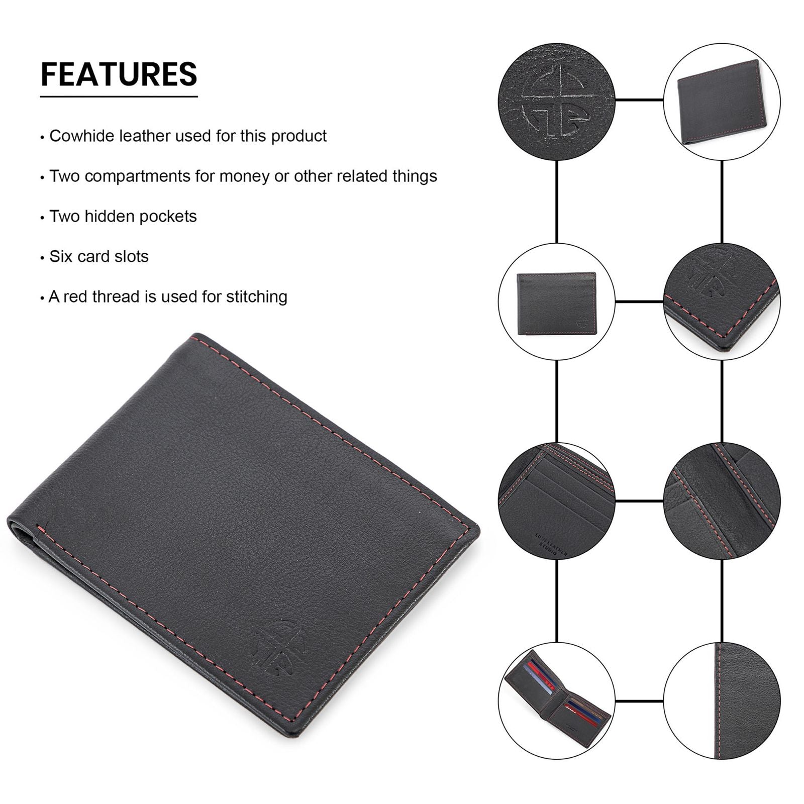 牛革を使って巧みに作られたこのバイフォールド・レザーウォレットは、優雅さと耐久性を兼ね備えています。赤い糸のディテールが視覚的に魅力的なアクセントを加え、全体的な美しさを引き立てています。